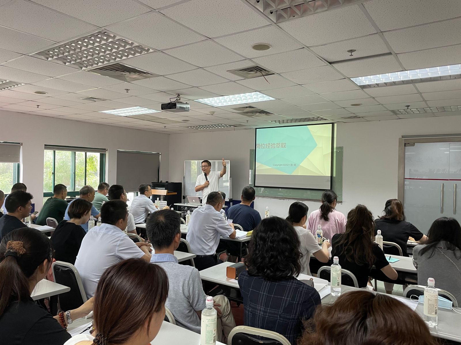 培训讲师以“牛人”做“牛事”为切入点,按照岗位工作职责化→职责工作事件化→事件工作场景化→场景工作流程化→流程工作经验化→错误工作显性化为顺序,指导全场学员以本职工作为例,进行实战演练。而后讲师从典型案例的特点出发,梳理案例的背景设计和场景设计,一步一步向学员展现了岗位经验萃取的全过程:场景梳理、故事化盘点(场景转问题)、结构性提炼(找出内部重要经验)、工具化输出(口诀话术)、文件化呈现。培训全程采用“讲、练、评、改”的方式,教学现场生动有趣。