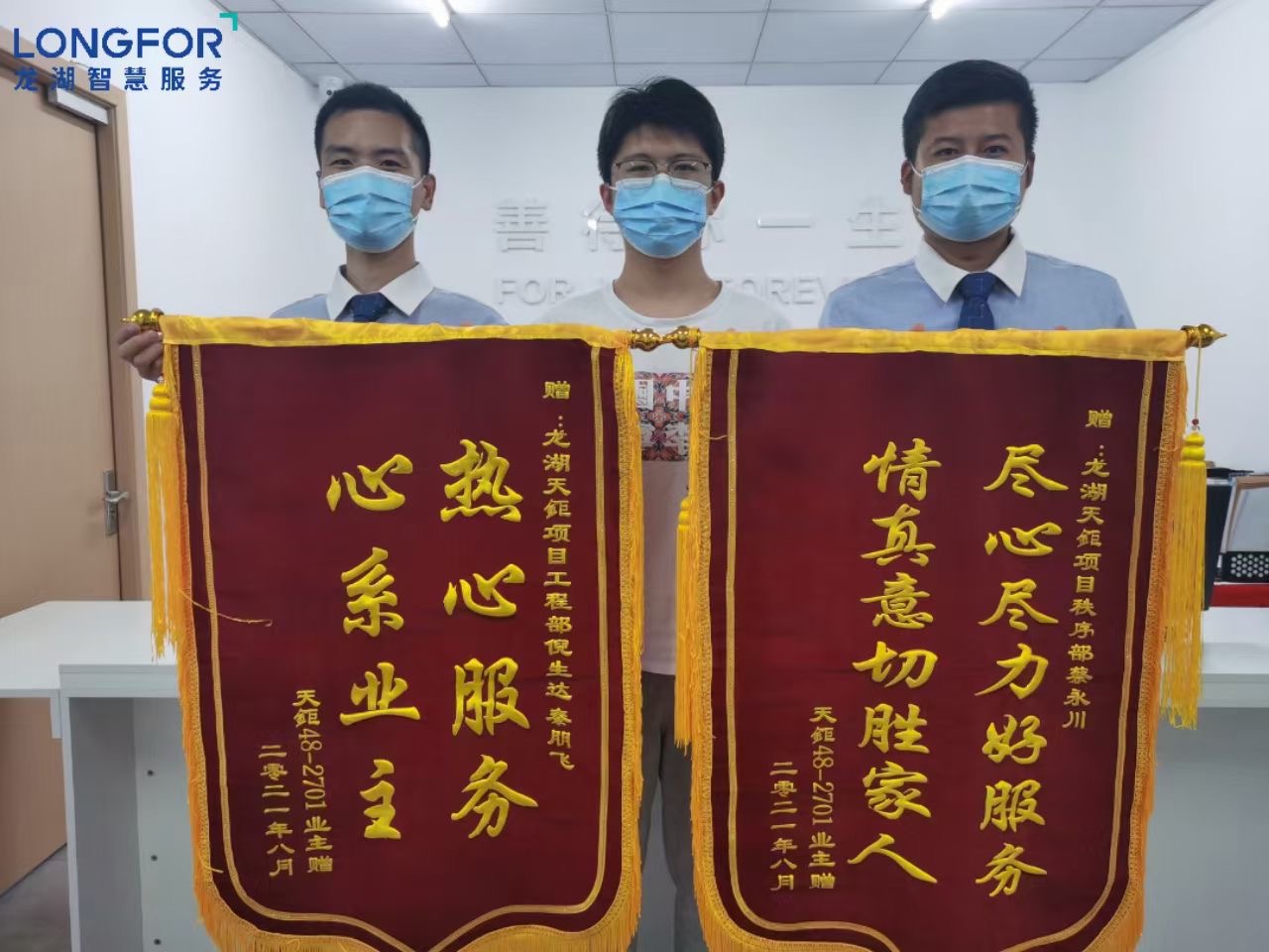 2021年8月的最后一天,龙湖天鉅的工程秦朋飞和秩序蔡永川同事收到了来自48-2701业主锦旗,而锦旗背后的故事,要从今年的3月说起……